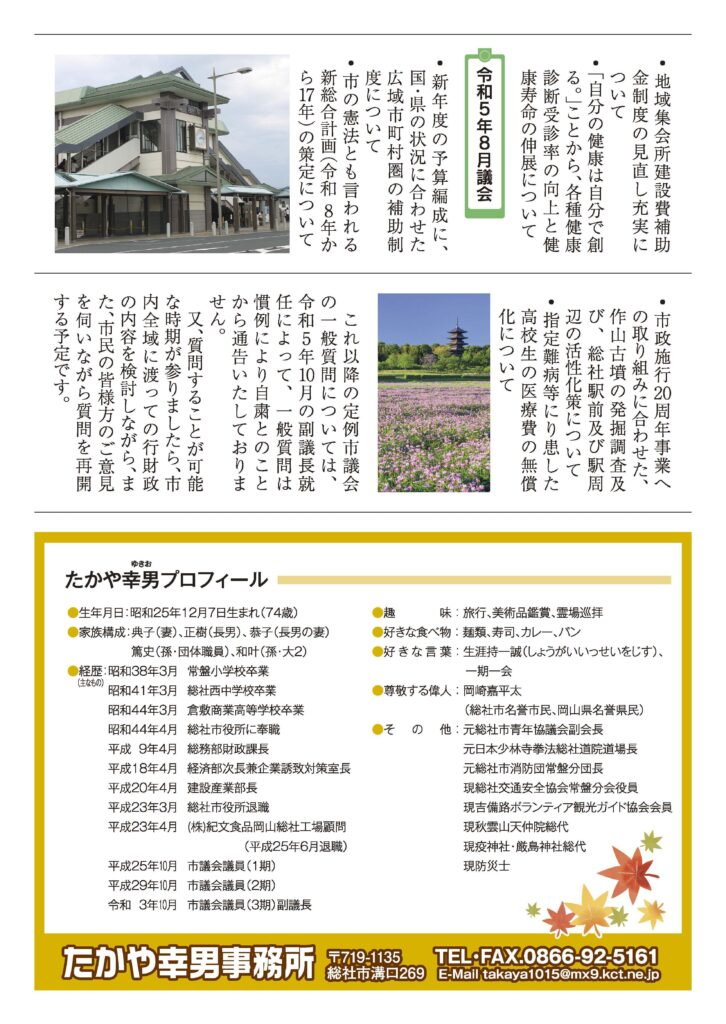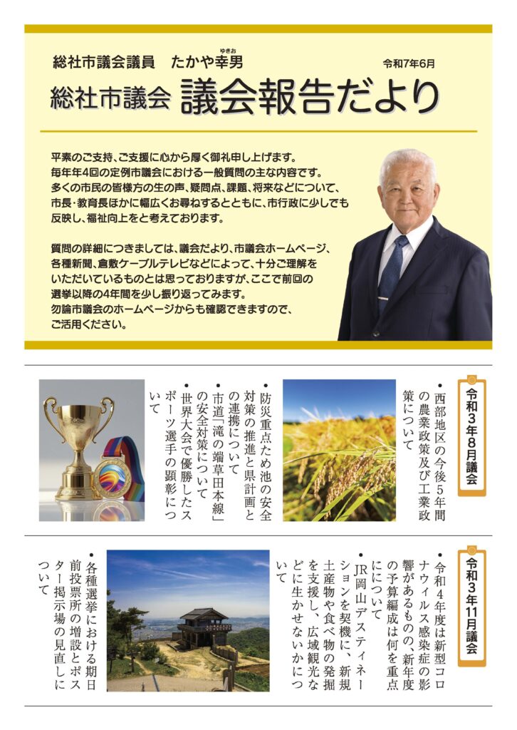 令和3年からの市議会での一般質問を中心に、たかや幸男市政報告だよりができあがりました。