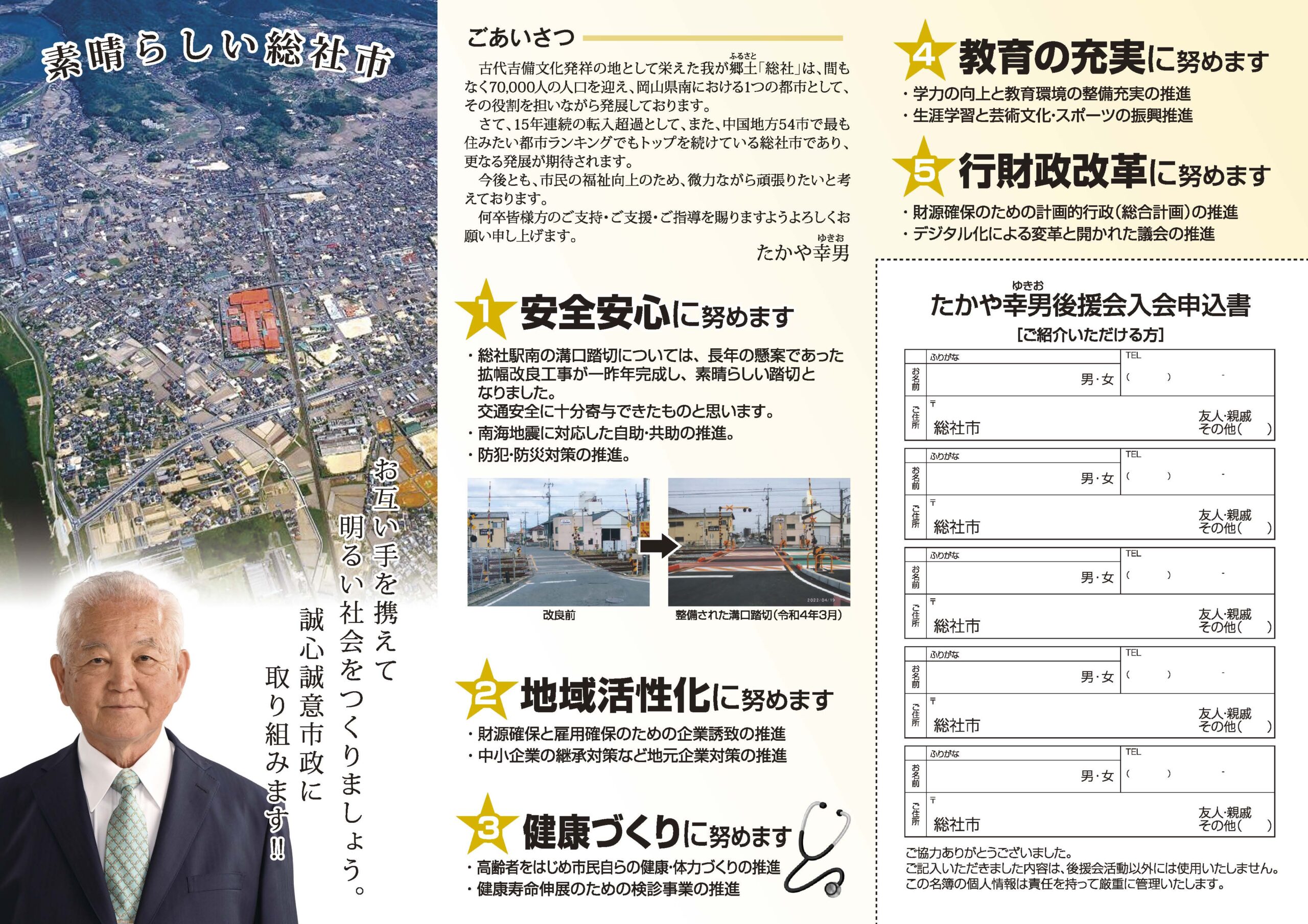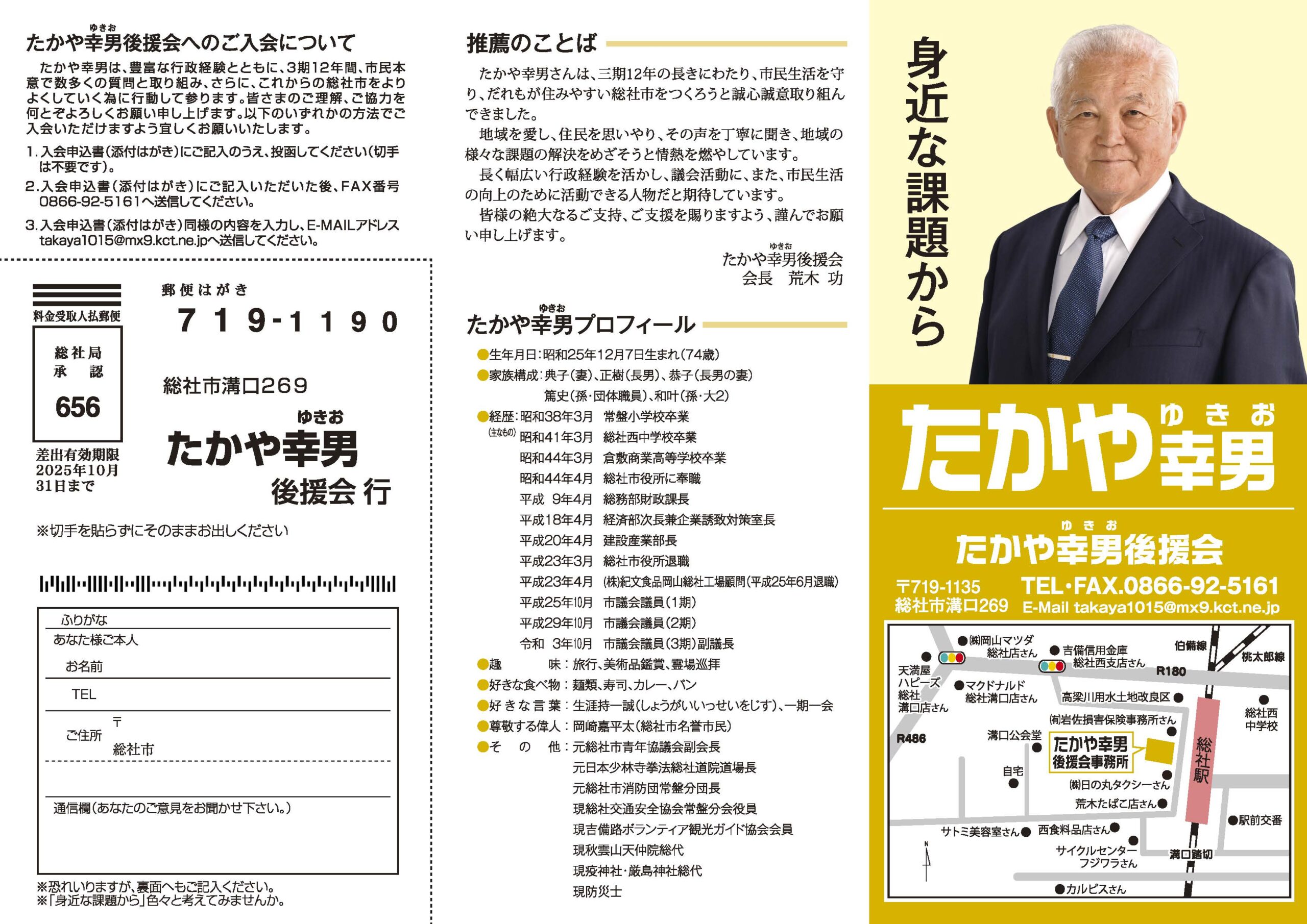 総社市議会議員たかや幸男(たかやゆきお)の後援会入会のパンフレットが出来上がりました。