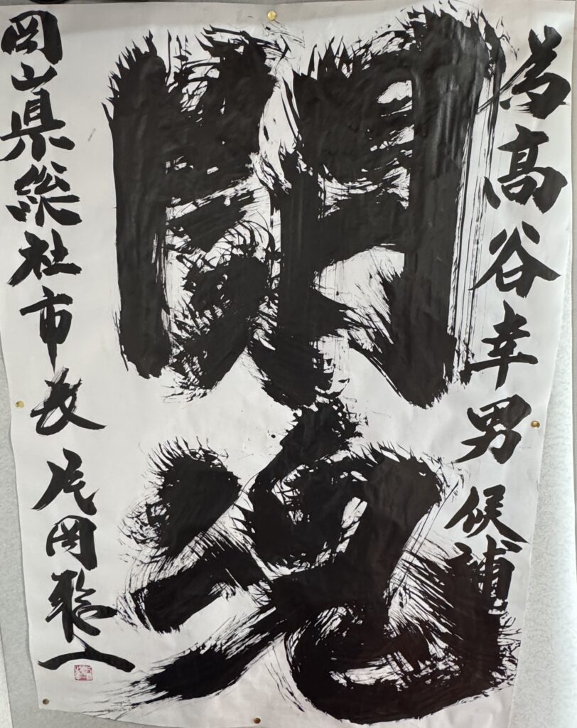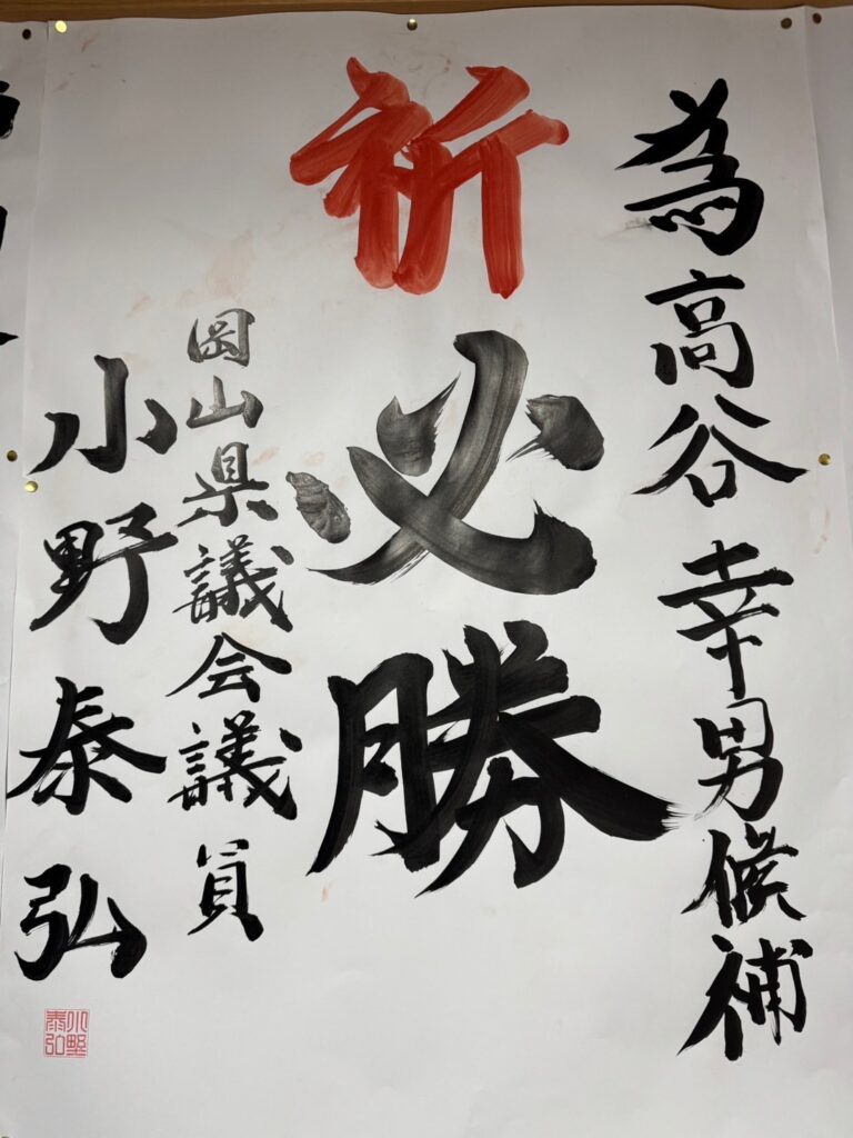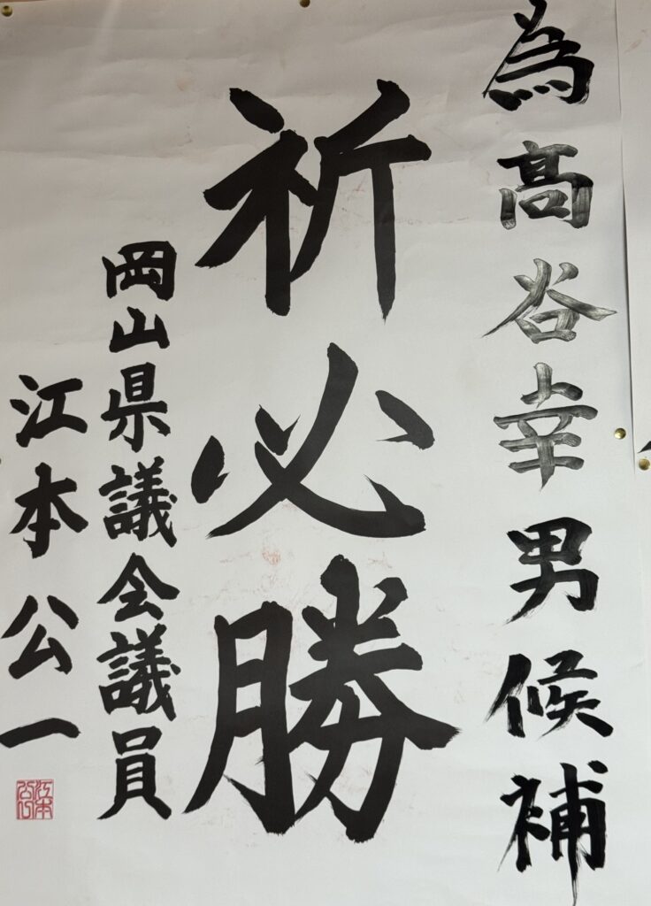 地元総社市の 片岡聡一市長 をはじめ、各方面から温かい激励の言葉を寄せていただき、壁いっぱいに掲げられた為書きは大きな励みとなっています。